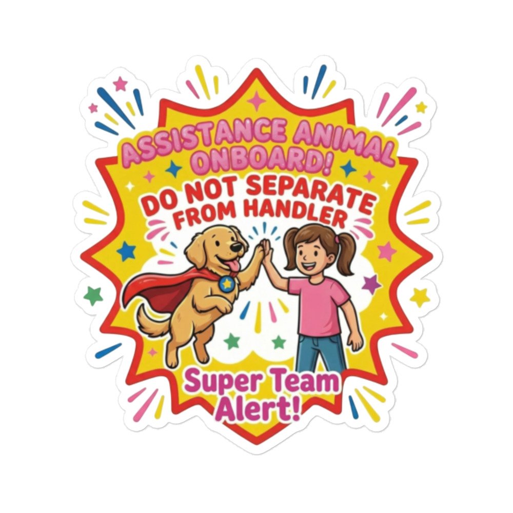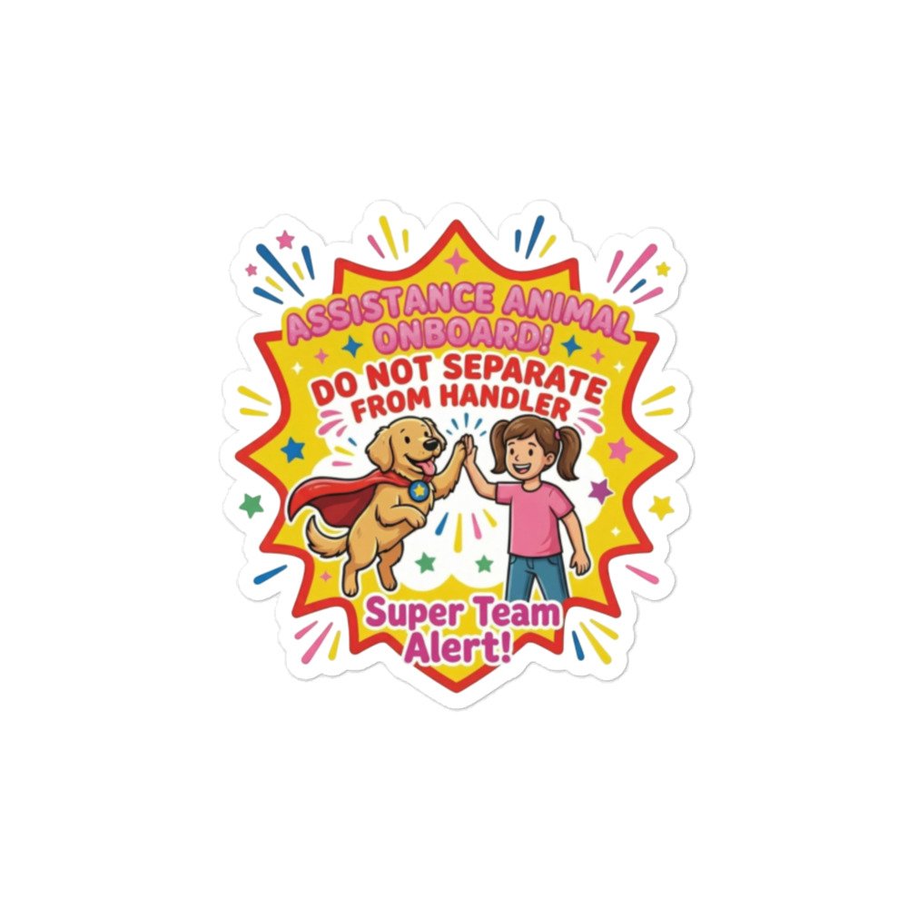 The bold “Super Team Alert!” theme makes this sticker ideal for children, families, schools, therapy settings, and public environments, helping others understand that an assistance animal and their handler work as a team and must never be separated.