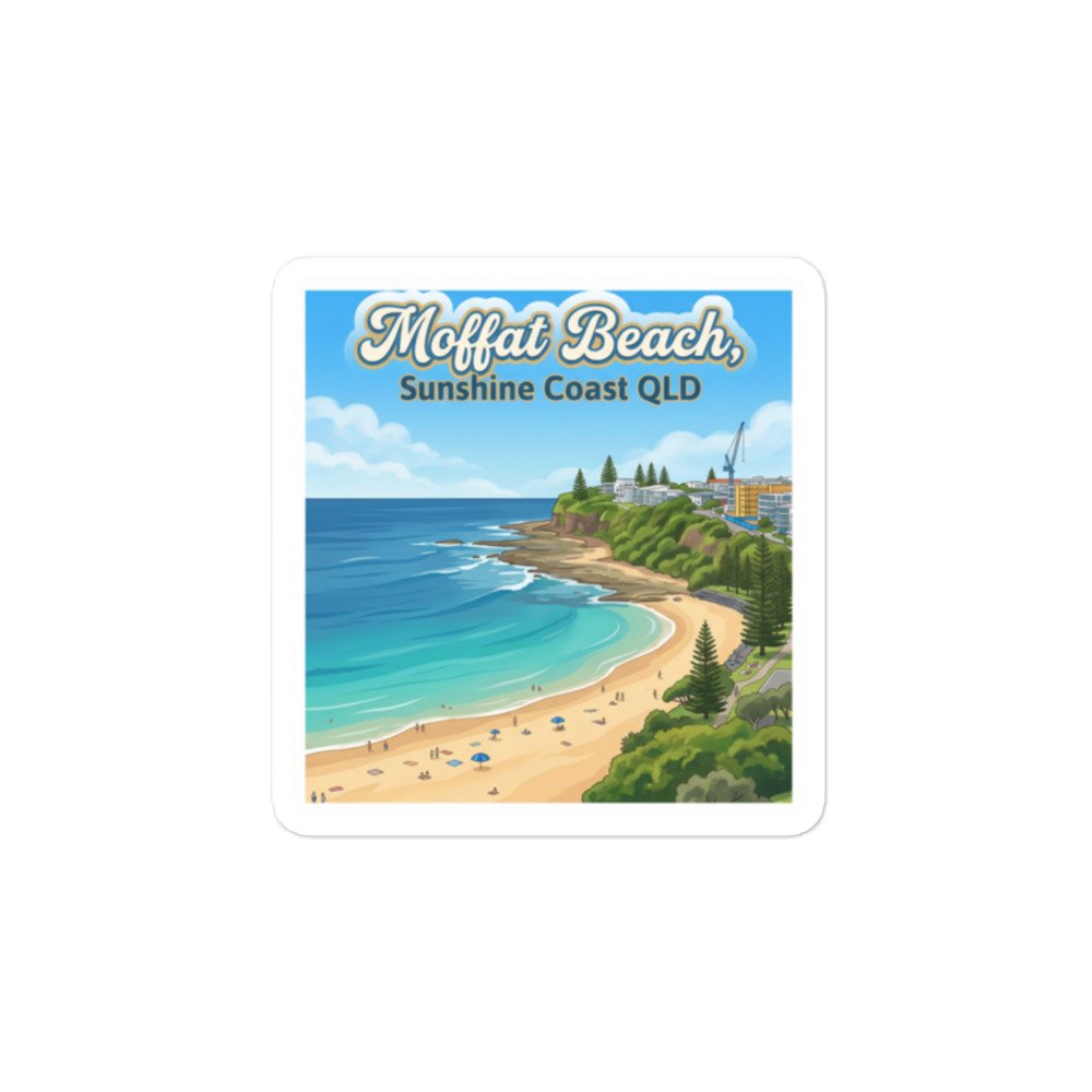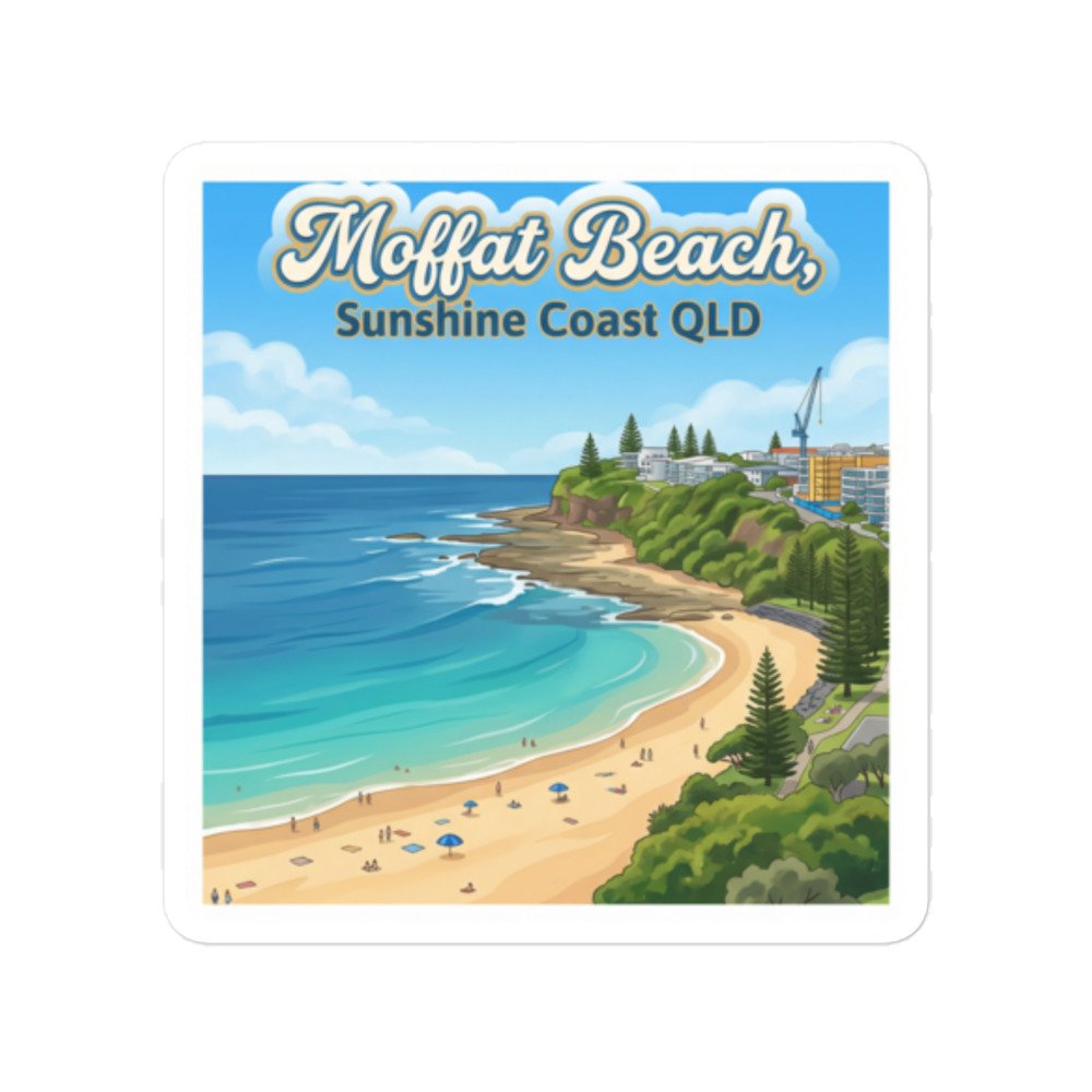 Capture the relaxed coastal charm of Queensland with this beautifully illustrated Moffat Beach, Sunshine Coast QLD sticker. Featuring a vibrant aerial-style view of turquoise waters, golden sands, lush headlands, and the iconic seaside skyline, this design brings beachside nostalgia and modern illustration together in one standout piece.