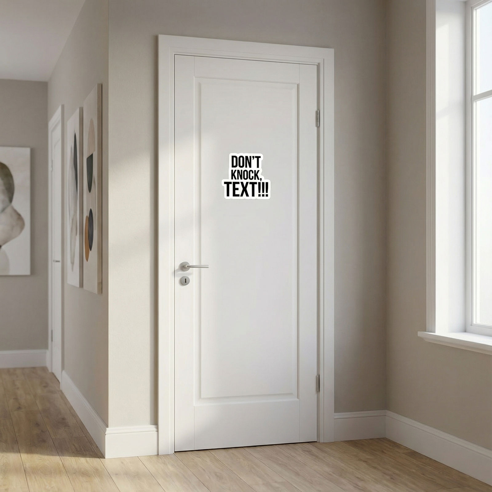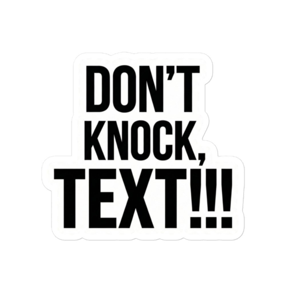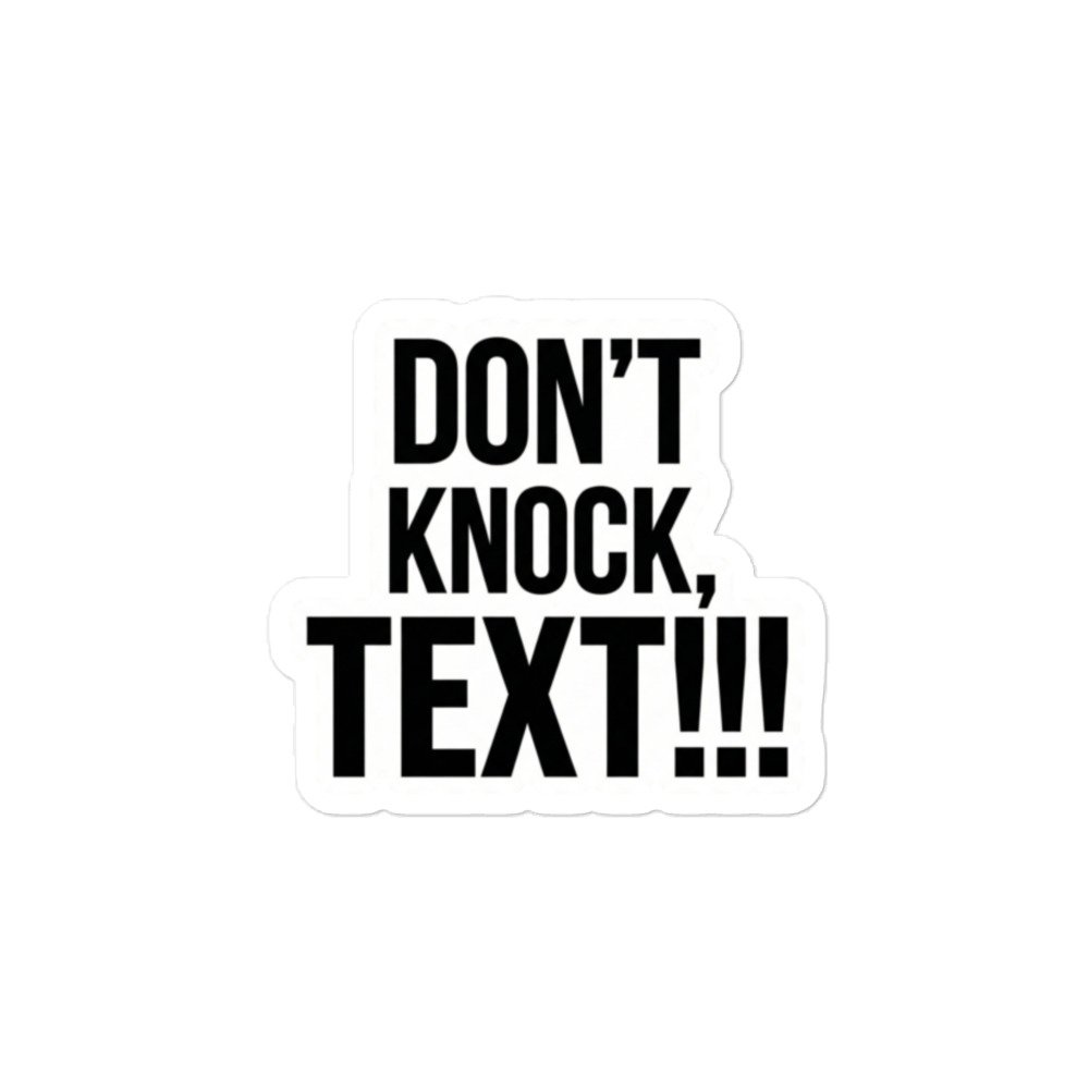 The Don’t Knock, Text!!! Sticker is a bold, easy-to-read vinyl decal designed to stop unwanted knocking and encourage texting instead. With high-contrast black lettering and a thick white outline, this sticker is impossible to miss and works perfectly on doors, windows, walls, and shared spaces.